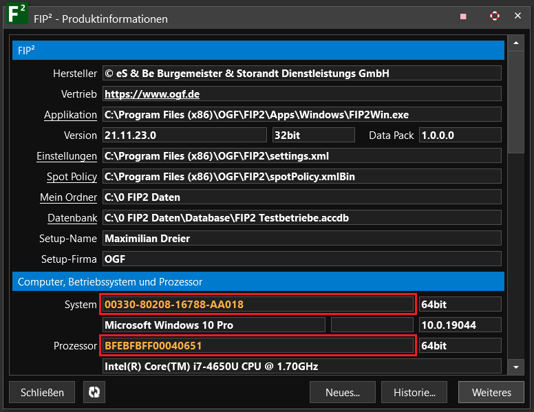 Kopieren Sie die Nummern unter System und Prozessor und schicken Sie diese Informationen für jeden zu lizensierenden Rechner an sachsen@ogf.de. Daraufhin erfolgt die Versendung der notwendigen Lizenzdaten.