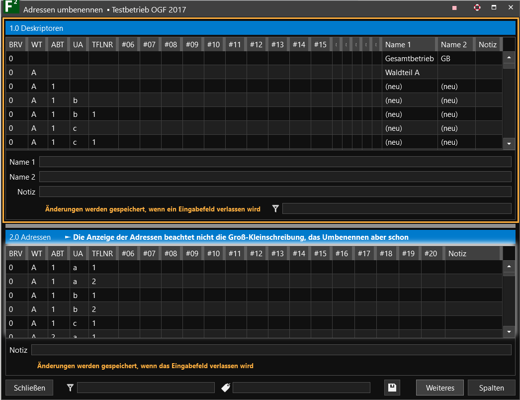 Im Bereich 2.0 Adressen ist es möglich, Waldadressen nachträglich umzubenennen. Dies ist jedoch nur bis zur Teilfläche möglich. In diesem Bereich sind daher alle im Forstbetrieb angelegten Waldadressen bis auf die Ebene der Teilfläche abgebildet.