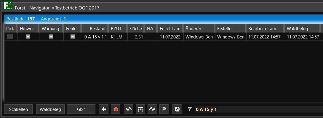 Die zu den Unterflächen gehörenden Bestände können im Navigator angezeigt werden. Nutzen Sie hierzu dessen Filterfunktion. Im vorliegenden Beispiel soll der Bestand 0 A 15 y 1.1 in 0 A 15 y 1.2 umbenannt werden.