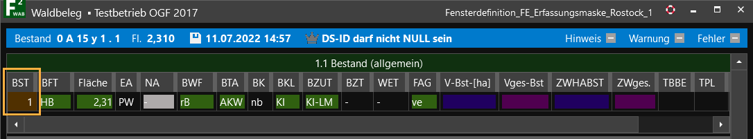 - Ändern Sie in Grid 1.1 unter BST die Bestandesnummer von 1 in 2 und speichern Sie die Änderung.