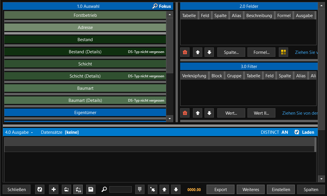 Starten Sie vor Beginn einer flexiblen Abfrage eine hinterlegte Standardabfrage, damit die Berichteinstellungen für den aktuell angemeldeten Forstbetrieb übernommen werden. Denn, erinnern Sie sich: Eine Forstbetriebsdatenbank kann in FIP² aus mehreren Forstbetrieben bestehen.