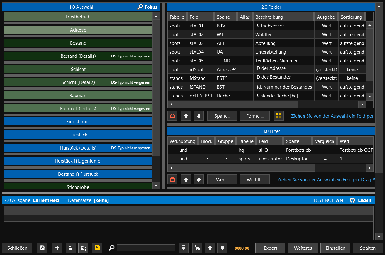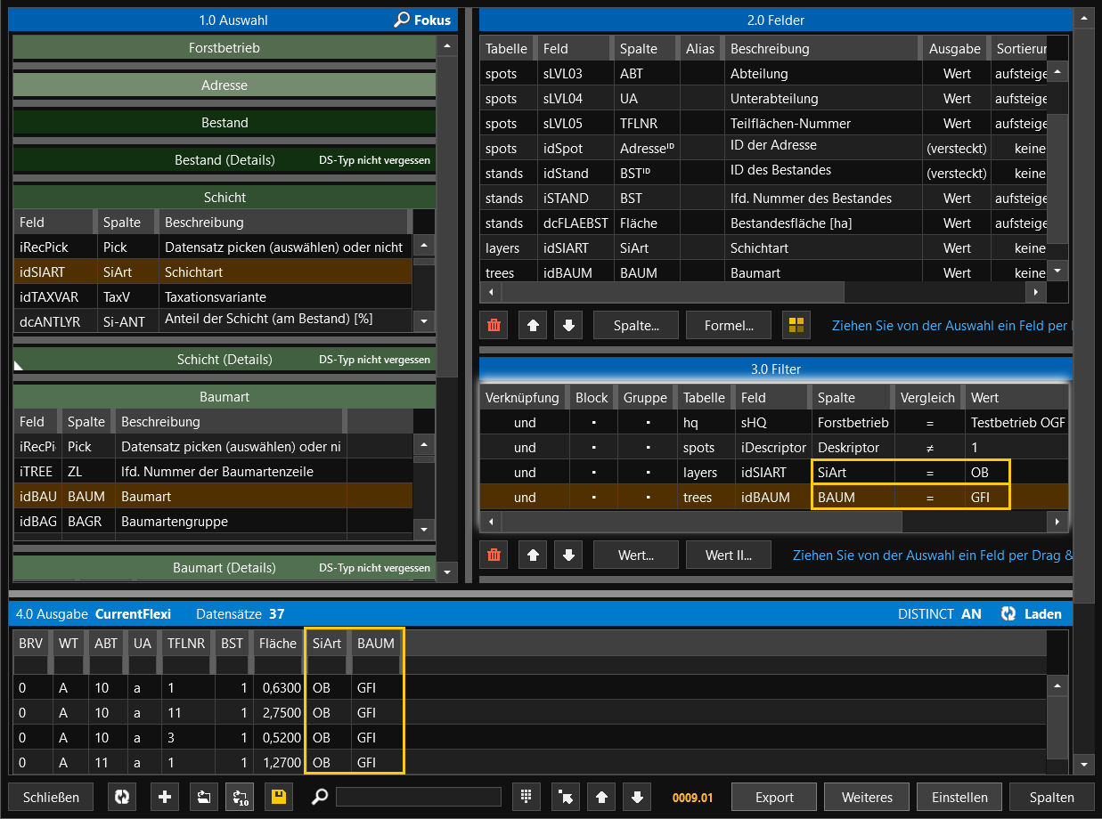 Wenn Sie nun erneut auf Ausgabe klicken, werden Ihnen nur noch Bestände in der flexiblen Abfrage angezeigt, welche im Oberstand die Baumart GFI besitzen.
