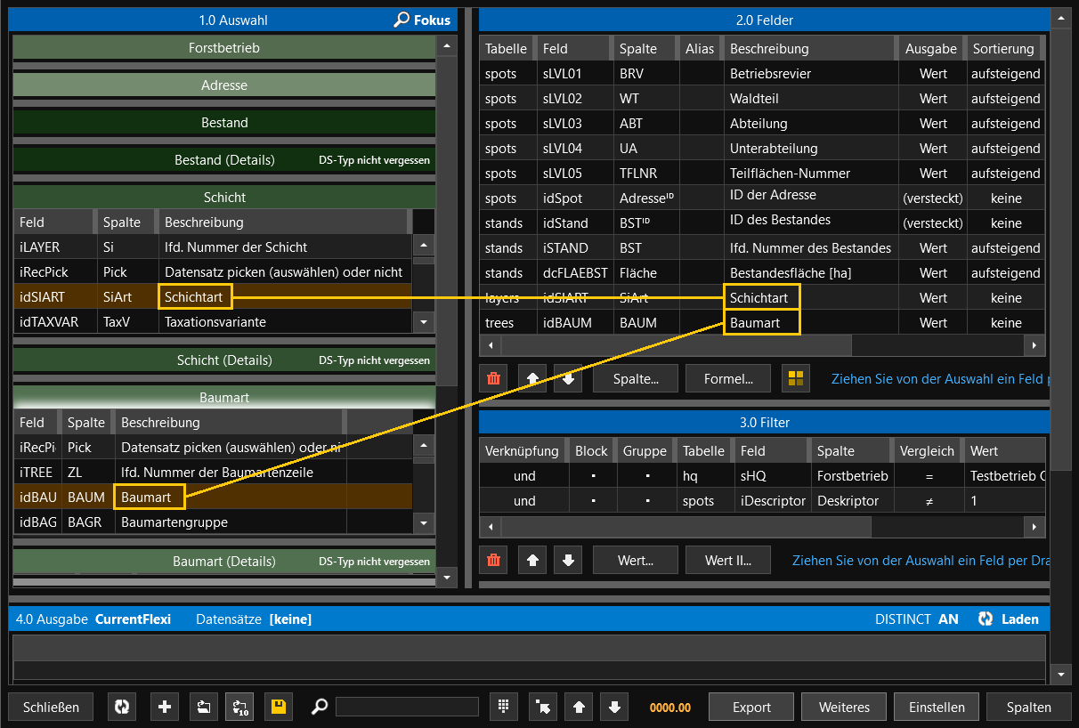 - Bei Klick auf Aktualisieren sehen Sie nun, dass im Bereich 4.0 Ausgabe für jeden Bestand und für jede Schicht die Baumartenzeilen ausgegeben wurden. Wenn sie noch weitere Informationen benötigen (z.B. Höhe, Flächenanteil, etc.), müssen Sie weitere Datenbankfelder aus dem Bereich 1.0 in den Bereich 2.0 ziehen.