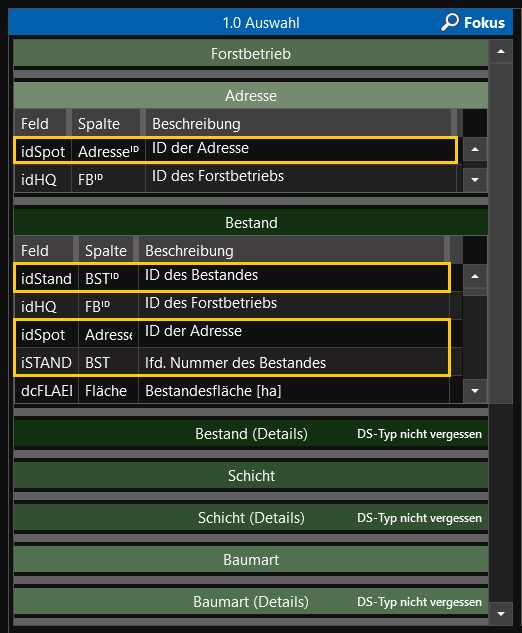 Dies betrifft folgende Felder sortiert nach Überschrift im Bereich 1.0 Auswahl:
