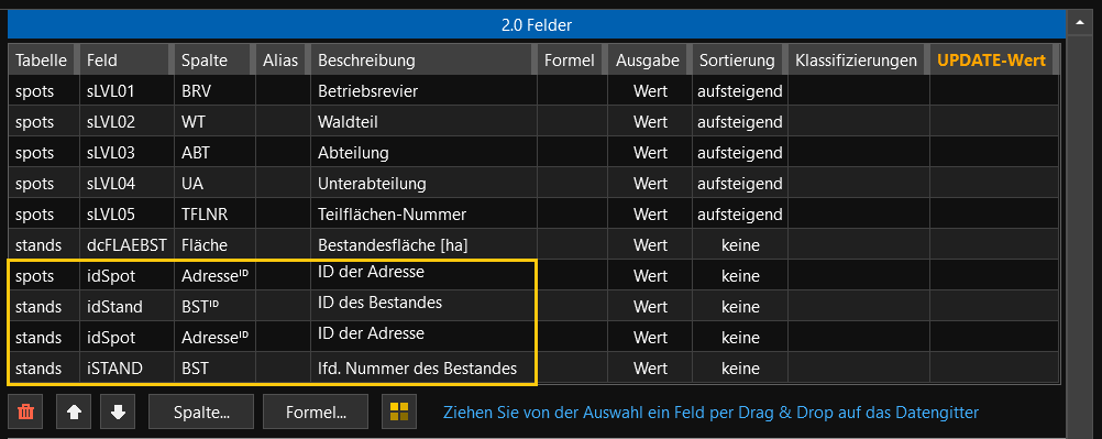 Um den flexiblen Bericht in FIP2 im GIS oder als Filter für die Standardberichte weiterzuverwenden, müssen bestimmte Datenbankfelder mit in den Bereich 2.0 Felder gezogen werden.