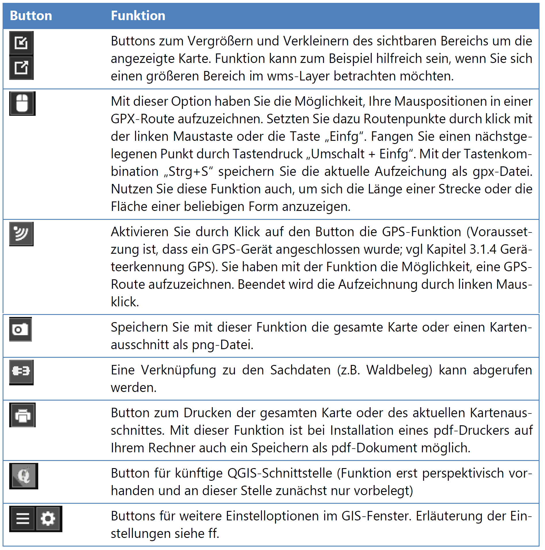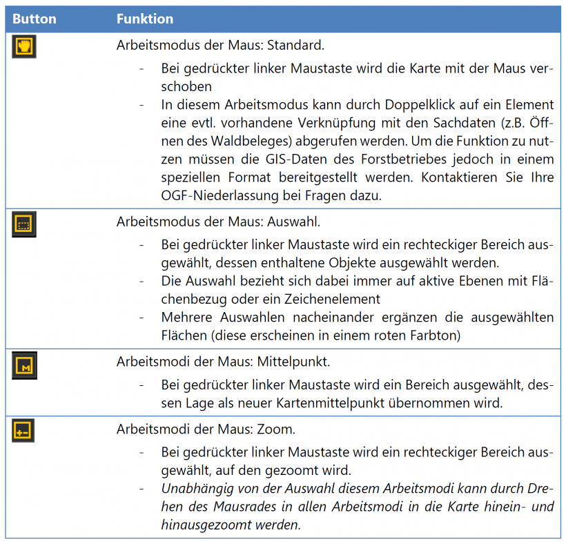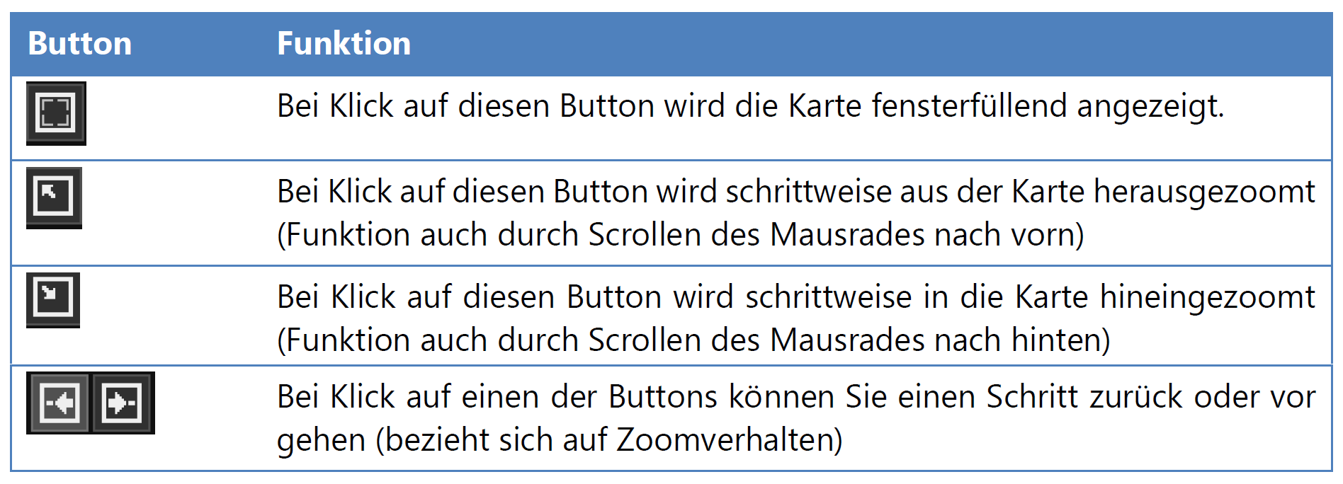 Die Befehlsleiste dient der Einstellung der Mausfunktion zur Arbeit mit der Karte im Visualisierungsfeld. Sie bildet dabei folgende Funktionalitäten ab: