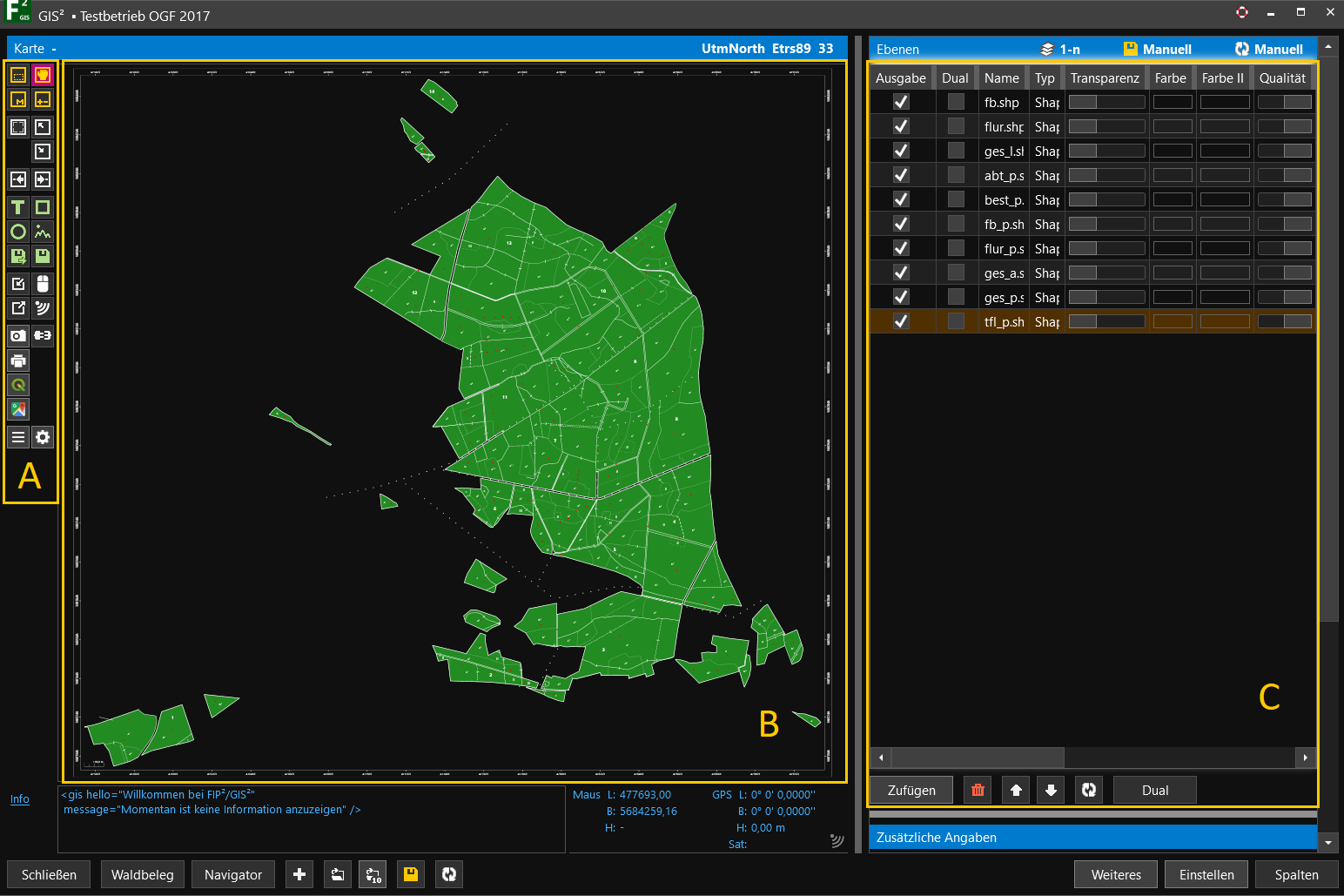 Im Visualisierungsfeld (B) wird Ihnen die aktuelle Karte / das GIS-Projekt angezeigt. Speichern Sie ein Projekt durch Klick auf den Button "Diskette" unterhalb des Visualisierungsfeldes. Oder öffnen Sie ein bestehende Karten-Definition durch Klick auf den Button "Ordner" .