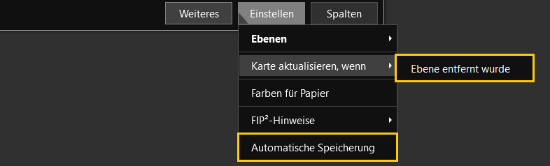 Dabei können Sie auswählen, das Visualisierungsfenster automatisch neu zeichnen zu lassen, wenn eine neue Ebene entfernt wird. Auch die automatische Speicherung der Karten-Definition lässt sich hier anwählen. Standardmäßig erfolgt sowohl die Aktualisierung wie auch die Speicherung manuell über die dafür vorgesehenen Buttons.