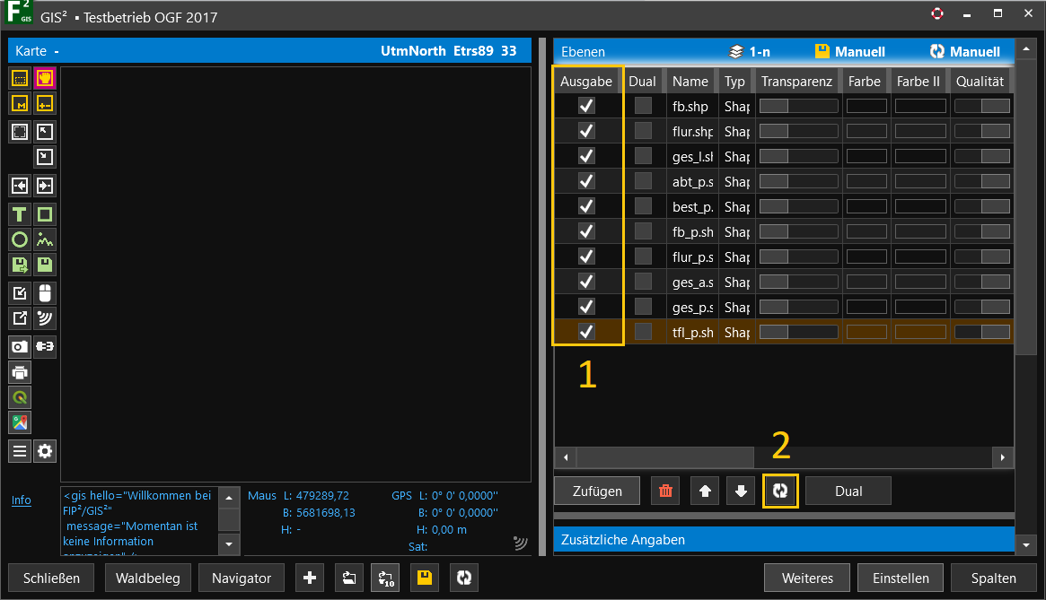 Die neu hinzugefügten Ebenen eines Projektes werden im Visualisierungsfenster standardmäßig erst angezeigt, wenn ein Haken in der Spalte Ausgabe gesetzt, sowie der Button zur Aktualisierung betätigt wurde.