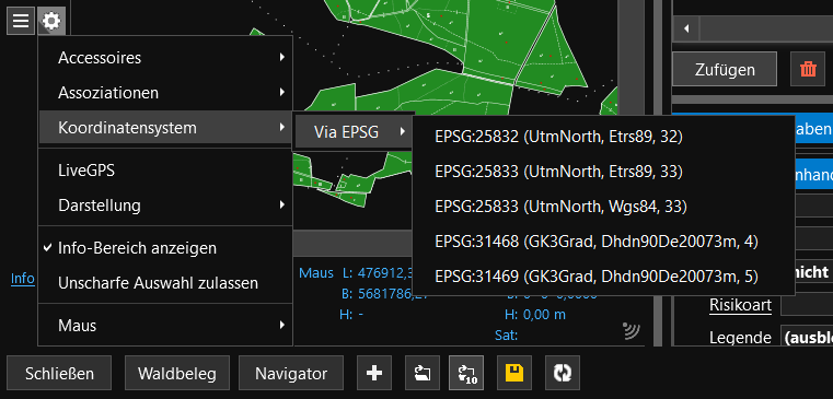 Wenn Sie eine neue Ebene in FIP² hinzufügen, dann versucht FIP² zunächst, dass hinterlegte Koordinatensystem automatisch auszulesen (z.B. über die PRJ-Datei einer SHP-Datei). Sollte dies fehlschlagen, dann gibt es eine Einstellmöglichkeit, um für den Layer ein FIP²-Koordinatensystem manuell zu definieren. Gehen Sie dazu in die Einstellungen unter Koordinatensystem und wählen Sie ein Koordinatensystem aus.