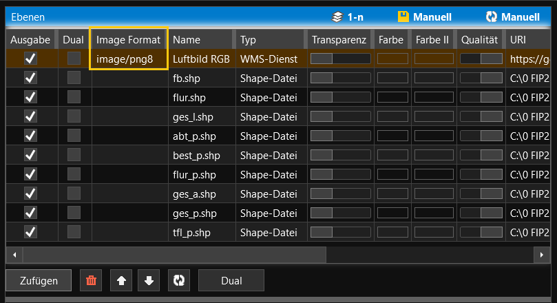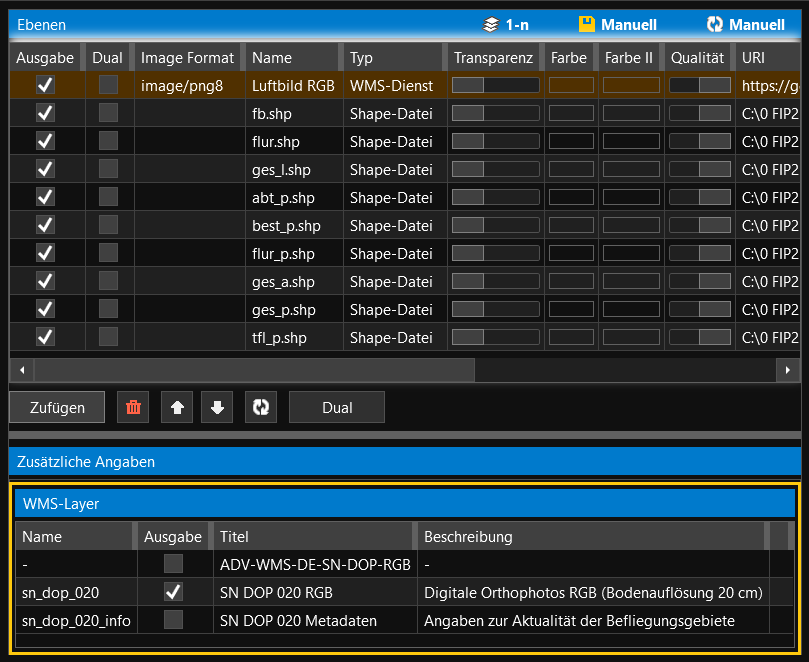 Die im Ebenen-Fenster anzuzeigenden Spalten können Sie wie gewohnt über den Button „Spalten“ im GIS-Fenster auswählen und auch per Drag&Drop beliebig verschieben. Der Name des wms-Layers wurde in der obigen Abbildung in „Luftbild RGB“ angepasst.