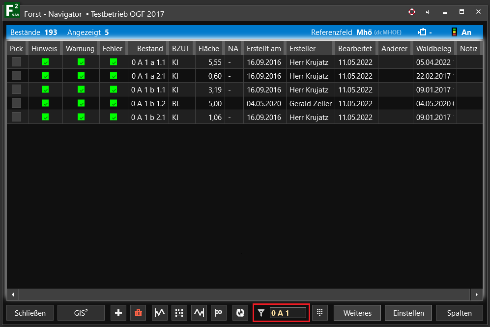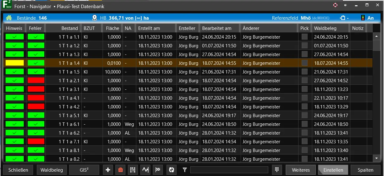 Wie aus der Abbildung ersichtlich, enthält der angemeldete Forstbetrieb 146 Datensätze (bzw. sind 146 Bestände eingetragen worden). Jeder Datensatz entspricht dabei einer Zeile in der Tabelle. Am Fensterfuß befindet sich eine Reihe von Schaltflächen, welche der Bedienung und Bearbeitung der Datensätze dienen.