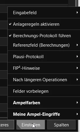 - Meine Ampel-Eingriffe: Hier können Sie festlegen, welche Operationen (Plausis vor den Berechnungen, Berechnung der Sekundärdaten, Plausis nach den Berechnungen) mit Klick auf den Button „Meine Ampel-Eingriffe“ (Fähnchen-Symbol) nacheinander durchgeführt werden sollen.