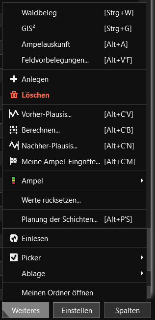 - Durch Klick auf Meine Ampel-Eingriffe… wird eine vorher definierten kombinierte Plausibilitätskontrolle durchgeführt. Wenn Sie Ihre „Meine Ampel-Eingriffe“ definiert haben, werden diese nach Ausführung dieser Funktion für alle Bestände des Navigators ausgeführt. Sie definieren Ihre „Meine-Ampel-Eingriffe“ über Navigator | Einstellen | Meine Ampel-Eingriffe. Wählen Sie hier die durchzuführenden Optionen (z. B. Plausiprüfungen vor den Berechnungen, Sekundärdaten-Berechnungen, Plausiprüfungen nach den Berechnungen.)