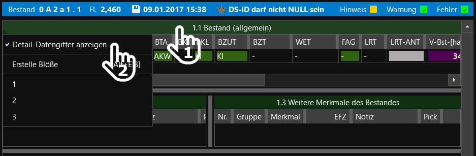 Der Aufbau des Waldbeleges lässt sich den eigenen Bedürfnissen und Wünschen anpassen. Die Funktionalität in der flexiblen Anpassung der Masken finden Sie auch in vielen anderen FIP2-Masken. Daher werden die Möglichkeiten hier nur exemplarisch beschrieben. Sie haben beispielsweise folgende Möglichkeiten: