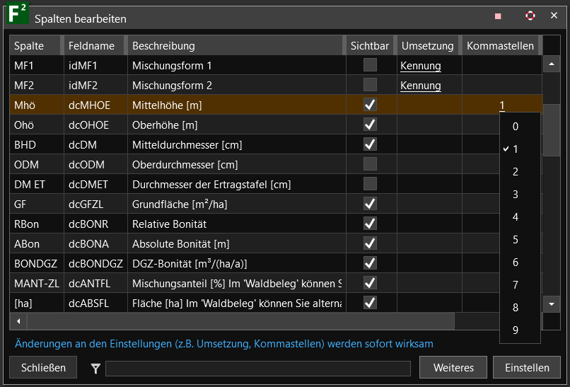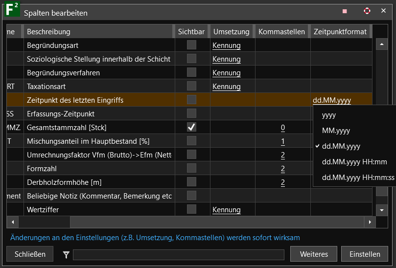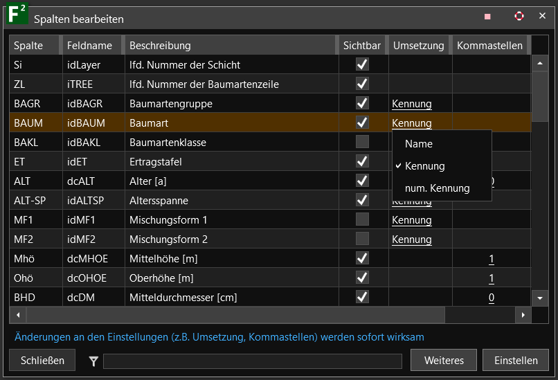 - Klicken Sie auf den Spalten-Button im rechts unten im Waldbeleg. Es öffnet sich das Fenster Spalten bearbeiten. In diesem Fenster sind alle möglichen Merkmale des ausgewählten Grids enthalten.