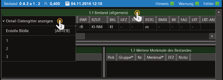 In den Grid-Menüs finden sich darüber hinaus Grid-spezifische Funktionen und Optionen. Diese ergänzen damit die grundlegenden Einstellungsmöglichkeiten des Waldbeleges. Welche Möglichkeiten es gibt, finden Sie in den jeweiligen Unterkapiteln zu den einzelnen Grids (siehe oben).