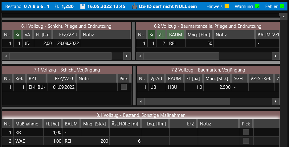 Grid zum Erfassen von baumartenzeilen-bezogenen Vollzugseintragungen |
