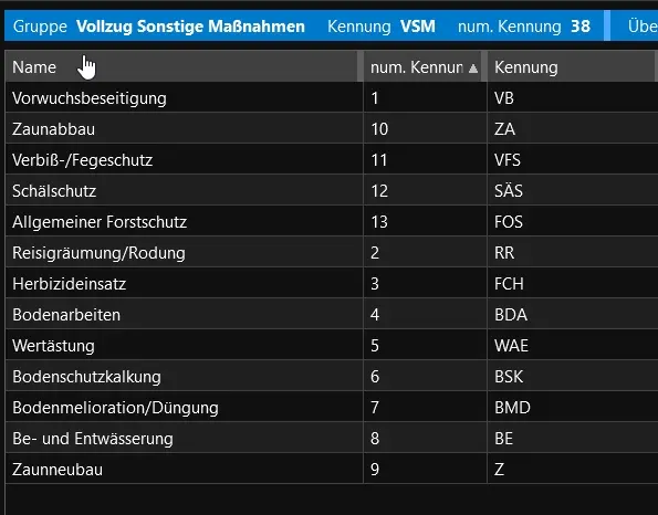 Folgende Sonstige Maßnahmen können bestandsweise gewählt werden: