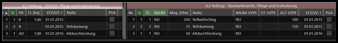 Es wird zwischen Nutzungsvollzug (Grids 6.1 und 6.2), Verjüngungsvollzug (Grids 7.1 und 7.2) und Vollzug sonstiger Maßnahmen (Grid 8.1) unterschieden.