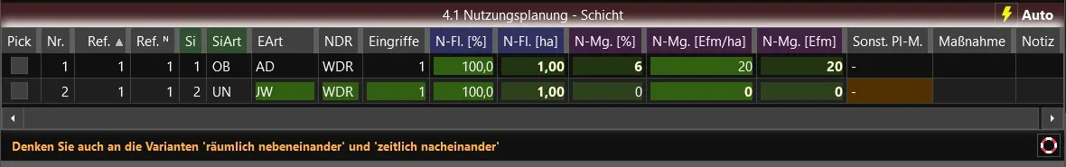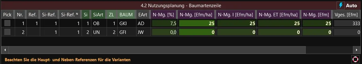- Sie haben nun alle planungsrelevanten Werte im Grid 4.1 erfasst und können die Planung auf die Baumartenzeilen (Grid 4.2) übertragen. Steht der Übertrag wie im Bild zu sehen auf "Auto" (rechte obere Ecke), so erfolgt dies beim Eintragen automatisch. Alternativ kann auch die Option "Manuell" gewählt werden - in diesem Fall erfolgt der Übertrag erst nach einem Klick auf den gelben Blitz.