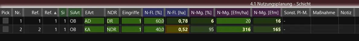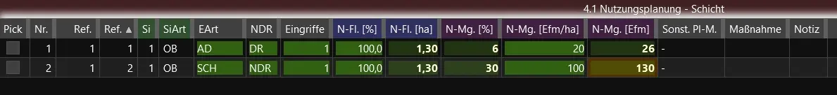 Für die Schichtenplanung tragen Sie alle Planungswerte ausschließlich im Grid 4.1 des Waldaufnahmebeleges ein.