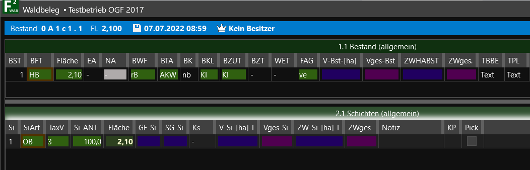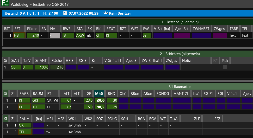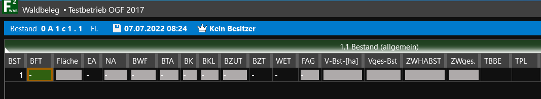 Wenn Sie im Navigator einen neuen Waldbestand angelegt haben und dann doppelt auf diesen Bestand klicken, öffnet sich das Waldbelegfenster für diesen Bestand.