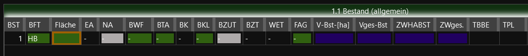 | 1.1 | Fläche (des Bestandes) | Nach Eingabe der Fläche wird diese auch permanent in der blauen Kopfzeile des Waldbeleges angezeigt |
