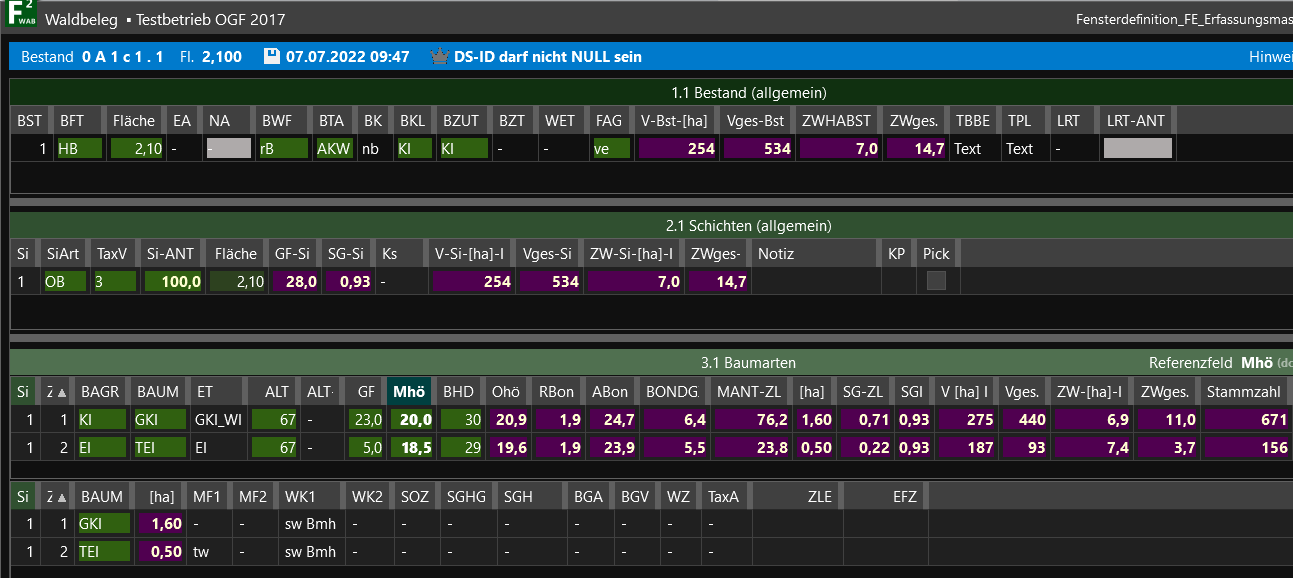 | 1.6 | INK, GAF, GL-Typ, GAF-ANT, BEF | Eingabe mindestens einer Zeile zum Gelände des Bestandes – der GAF-ANT sollte bei mehreren Zeilen 100 % betragen |