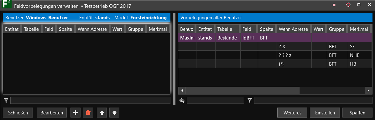 Auf der linken Seite des Fensters sind alle eingestellten Feldvorbelegungen des aktiven Nutzers eingetragen. Auf der rechten Seite des Fensters sind die Feldvoreinstellungen für alle Nutzer von FIP² eingetragen (nur relevant, wenn an einem Arbeitsplatz mehrere Nutzer FIP² verwenden).
