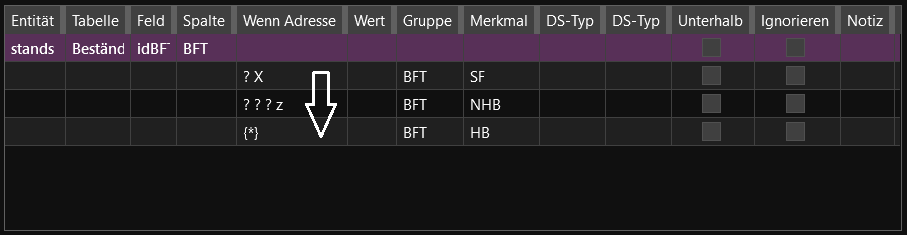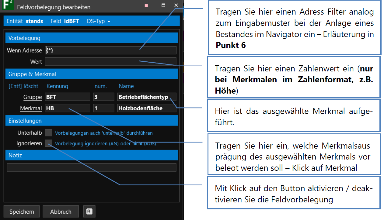 | 0 A 1 d 3.2 | Feldvorbelegung nur für diesen Bestand (wenig sinvoll) |