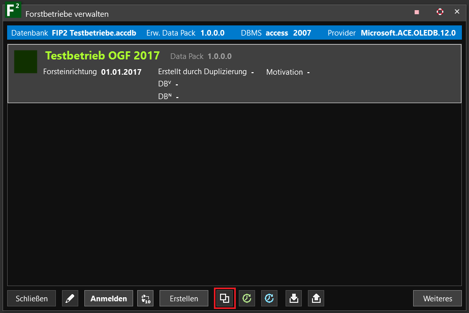 Eine Duplizierung bezieht sich auf die Daten eines Forstbetriebes, nicht auf die Daten einer gesamten Datenbank. Eine Datenbank kann mehrere Forstbetriebe beinhalten. Nach der Duplizierung befinden sich die Daten des Forstbetriebes in einer neuen Datenbank, die nur die duplizierten Daten enthält.