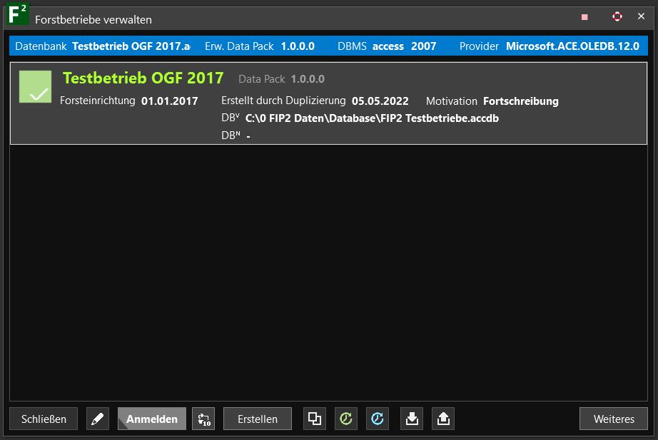 Nach der Duplizierung sind Sie immer noch mit der Ursprungsdatenbank „Testbetrieb OGF 2017.accdb“ angemeldet. Den Namen und Speicherort des Duplikats finden Sie unter DB^V.