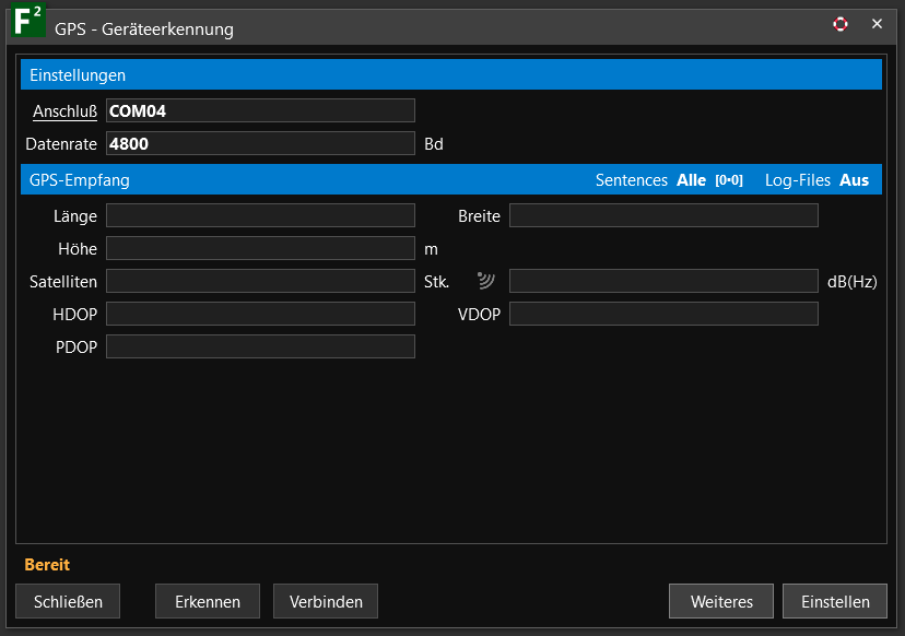 Hinterlegen Sie die für Ihren PC zutreffenden Einstellungen und klicken Sie anschließend auf den Button Erkennen. FIP² sucht daraufhin nach angeschlossenen oder integrierten GPS-Geräten. Wurde ein entsprechendes Gerät erkannt, kann über den Button Verbinden eine GPS-Verbindung hergestellt werden.