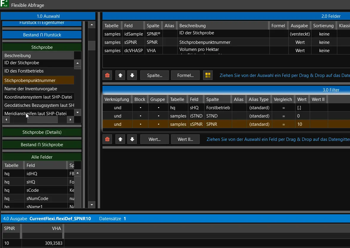 Im obigen Beispiel wurde die Standardabfrage um einen Filter im Grid 3.0 erweitert: SPNR=10. Damit wird der die Abfrage nur für den Stichprobepunkt 10 durchgeführt. Das Ergebnis der Abfrage wird im Grid 4.0 dargestellt: der Hektarvorrat (VHA) am Stichprobepunkt 10 beträgt 309 Vfm.