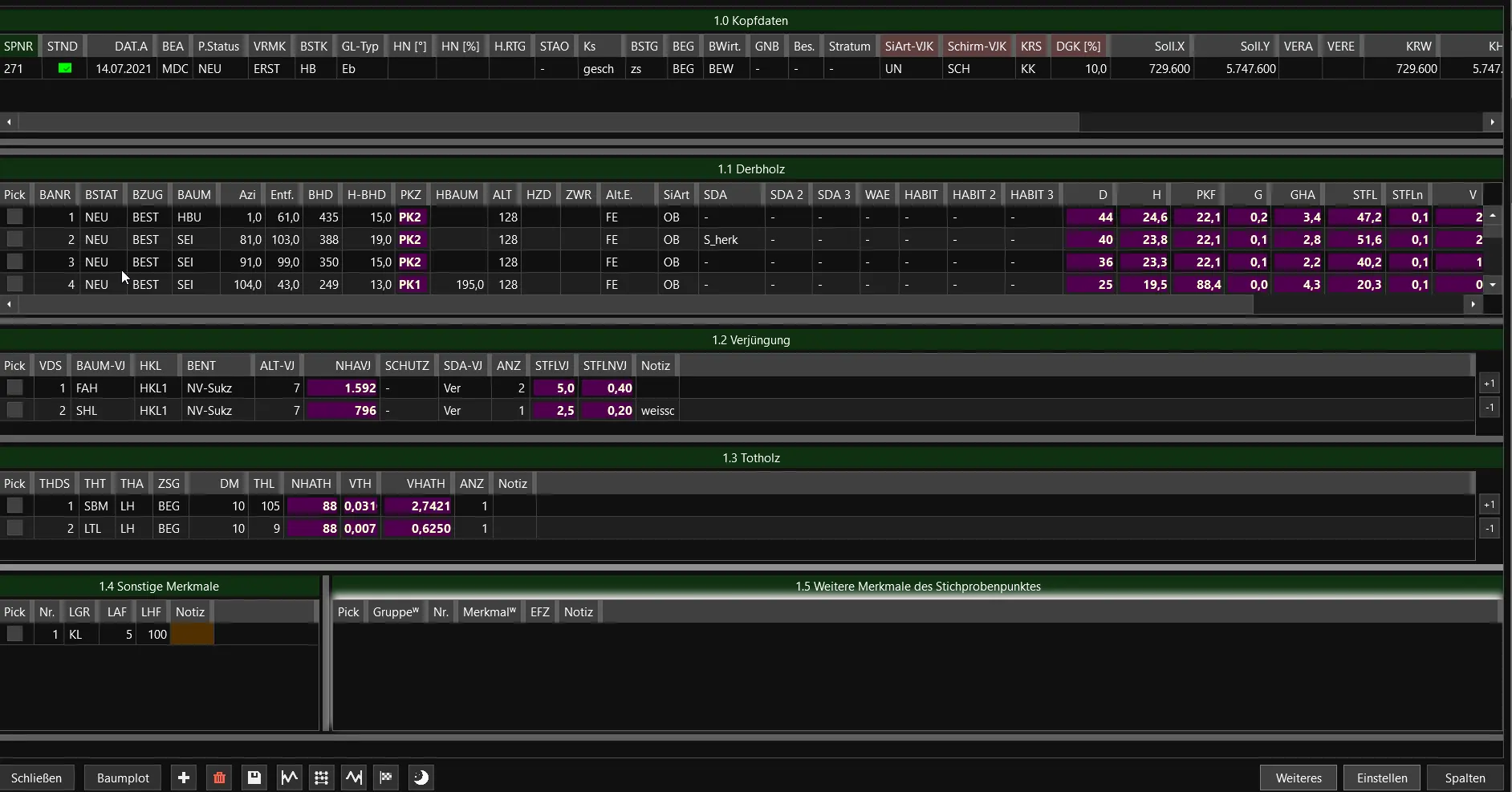 Über die Schaltfläche PUNKTBELEG gelangt man zur Eingabemaske für die Datenerhebung am Stichprobenpunkt. Die Eingabemaske hat ein festgefügtes Grundgerüst. Dieses besteht aus sechs Datenraster (sog. Grids). Jedem Grid sind Merkmale der jeweiligen Bezugseinheit zugeordnet (Derbholzdaten, Verjüngungsdaten etc.). Damit soll eine systematische Datenerhebung im Wald gewährleistet werden.