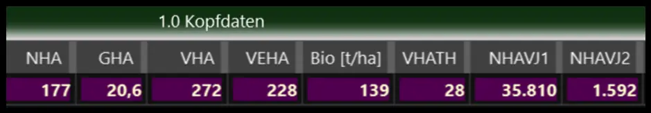 Alle farbig unterlegten Felder ergeben sich aus Berechnungen. Für jeden Derbholzbaum werden die Angaben je Hektar für Stammzahl (PKF = NHA), Grundfläche (GHA), Volumen (VHA), Erntevolumen (VEHA), Biomasse (Bio) ausgewiesen. Für das Totholz wird das Volumen (VHATH) und für die Verjüngung wird die Stammzahl der zwei Höhenkassen (NHAVJ1, NHAVJ2) bereitgestellt. Durch Summation über alle Bäume hinweg ergeben sich die Werte für den Probepunkt, die in den Kopfdaten (Grid 1.0) ausgewiesen werden.