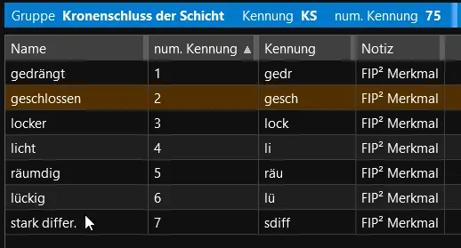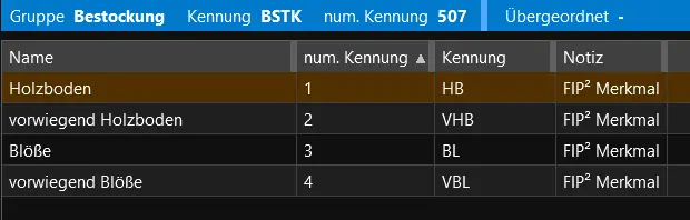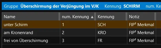 Eine Auswahl ist folglich nur dann möglich, wenn die Verjüngung im Merkmalsfeld SCHICHTART DER VERJÜNGUNG (SiArt-VJK) als Unterstand definiert wurde. Anderenfalls ist das Feld blockiert.