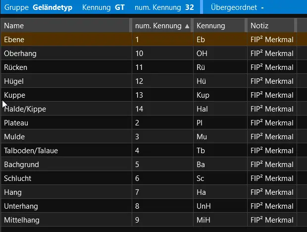 Das Merkmal gibt Auskunft über die Geländeform (Relief) am Stichprobenpunkt innerhalb des Probekreises mit dem größten Radius.