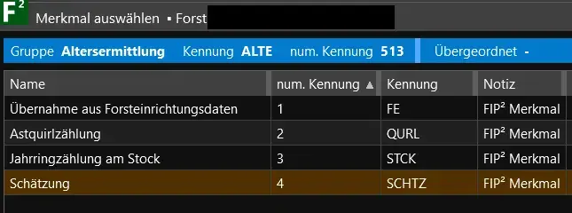 Weitere Baumarten können in FIP2 über die Merkmalsverwaltung für das MOS NICHT aufgenommen werden. Nicht gelistete Baumarten sind zuzuordnen. Eintrag der Baumart im Feld Notiz möglich. (Bemerkung; da keine Verknüpfung zu Vorrats- und Biomasseberechnung in BDAT vorgegeben!!!!!)