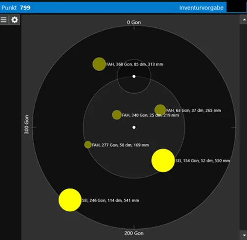 Beschreibung: automatische Zuordnung eines erfassten Baumes zu vorab definiertem Probe- kreis anhand BHD und Entfernung (keine Eingabe!)
