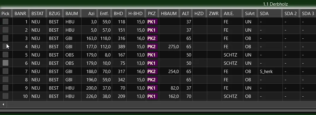 Im folgenden Beispiel wird das Grid 1.1 Derbholz mit Beispieldaten dargestellt: