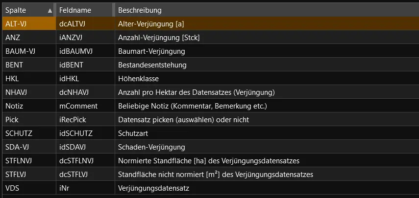 Im Folgenden werden Merkmale aus dem Grid 1.2 Verjüngung beschrieben: