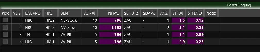 Im folgenden Beispiel wird das Grid 1.2 Verjüngung mit Beispieldaten dargestellt: