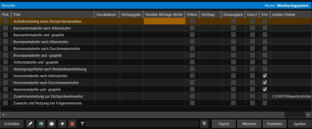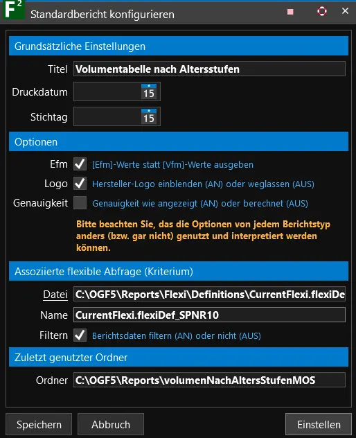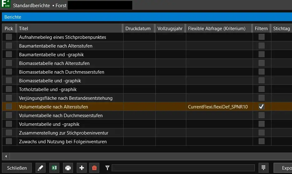Die Berichte werden in den Standardeinstellungen für den gesamten Forstbetrieb ausgegeben. Es gibt jedoch auch Möglichkeiten, einen Bericht mit einer flexiblen Abfrage zu verknüpfen. Klicken Sie dazu in der Übersicht der Standardberichte mit Doppelklick in die Spalte Flexible Abfrage (Kriterium).