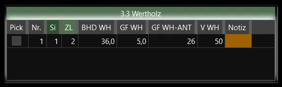 Im folgenden Beispiel wurde für die Baumartenzeile Nummer 2 der Schicht 1 Wertholz mit einem BHD von 36 cm, einer Grundfläche von 5 m² mit insgesamt 50 Vfm. erfasst.