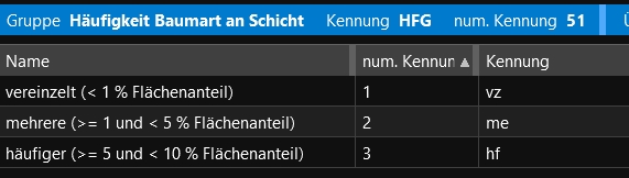 Für die Häufigkeit der weiteren Baumart an der Schicht gibt es folgende Standard Ausprägungen: