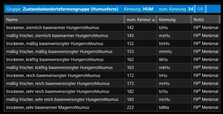 Humusform (HUM) Eingabe nur für HB, NHB und NEF nach unten genanntem Schlüsselauszug; im Wesentlichen keine Eingabe für SF Die Humusform (auch Zustandsstandortsformengruppe) charakterisiert den aktuellen Zustand des Oberbodens. Sie bringt Abweichungen von den Stammstandortseigenschaften zum Ausdruck. Sie kann aus verschiedenen Unterlagen abgeleitet werden (Standortskarte, Digitalisierung, spezielle Kartierung). Es handelt sich um keine Pflichteingabe.