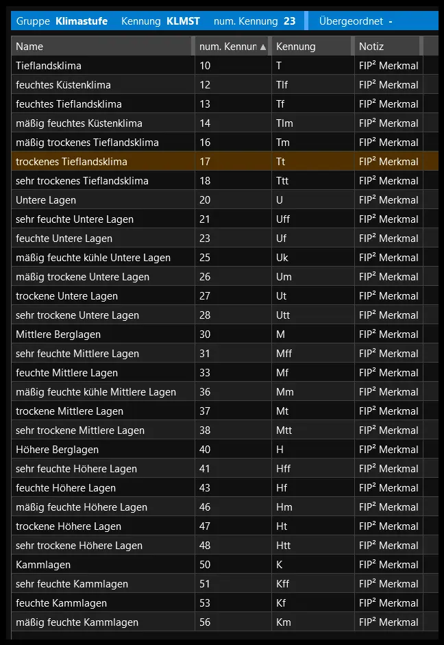 Klimastufe Standort (KS) Eingabe nur für HB, NHB und NEF nach unten genanntem Schlüsselauszug; im Wesentlichen keine Eingabe für SF Klimastufen bringen die Höhen- und Feuchtestufe zum Ausdruck. Sie bilden zusammen mit der nachfolgenden Standortsgruppe die sogenannte Standortsformengruppe als eine Grundeinheit. Es handelt sich um keine Pflichteingabe.