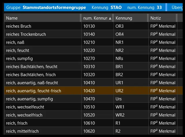 Standortgruppe (STAO) Eingabe nur für HB, NHB und NEF nach unten genanntem Schlüssel; im Wesentlichen keine Eingabe für SF. Die Standortsgruppe (auch Stammstandortsgruppe) als Teil der Standortsformengruppe besteht aus Bodenfeuchtestufe, Trophiestufe und Wasserhaushaltsstufe (z.B. OR3, TM2). Sie dient der Beurteilung der ökologischen und waldwachstumskundlichen Wertigkeit von Standortsund Bestockungsmerkmalen. Es handelt sich um keine Pflichteingabe.